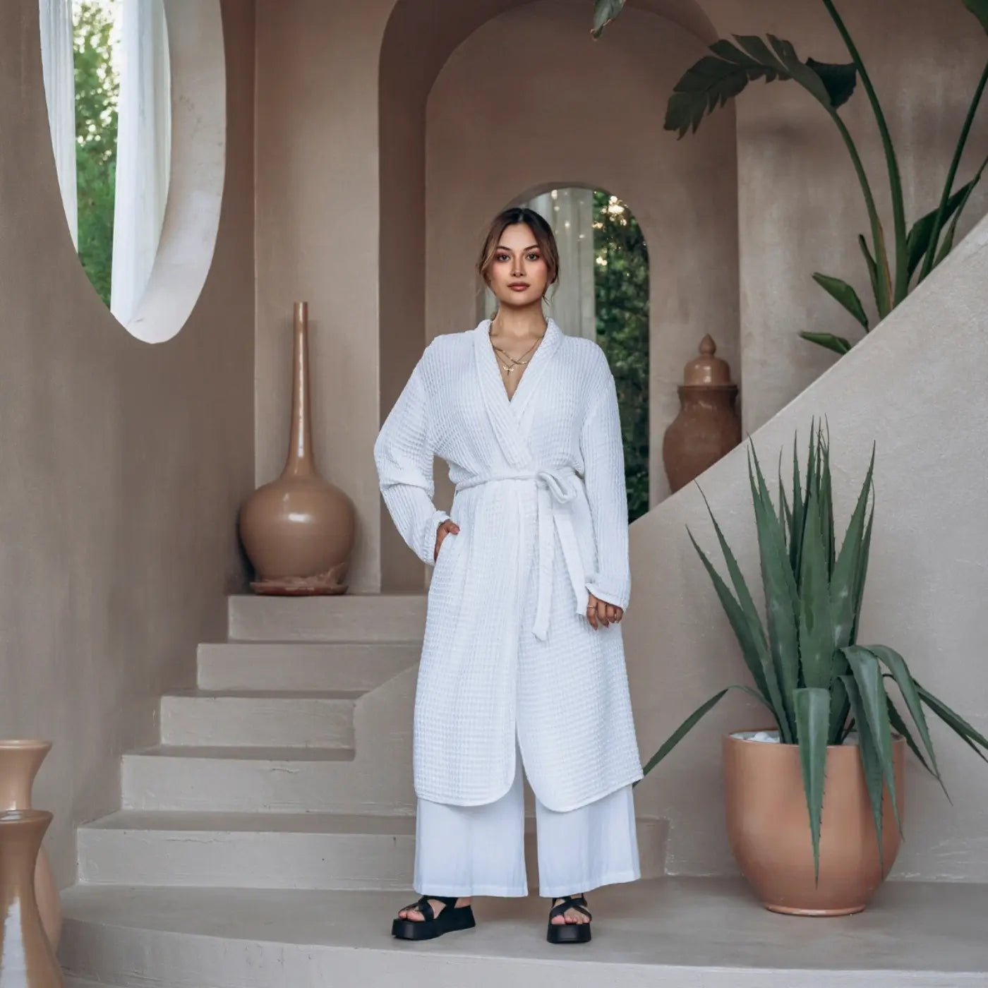 Peignoir en coton gaufré léger — luxe spa à la maison et en voyage